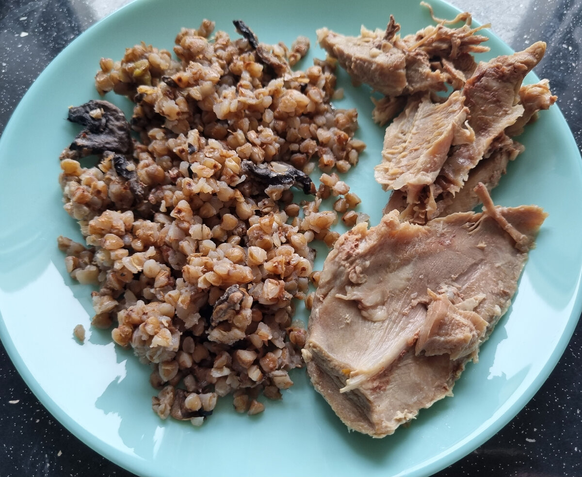 На завтрак была гречка с грибами, отварная индейка и салат из айсберга, огурцов и черри.