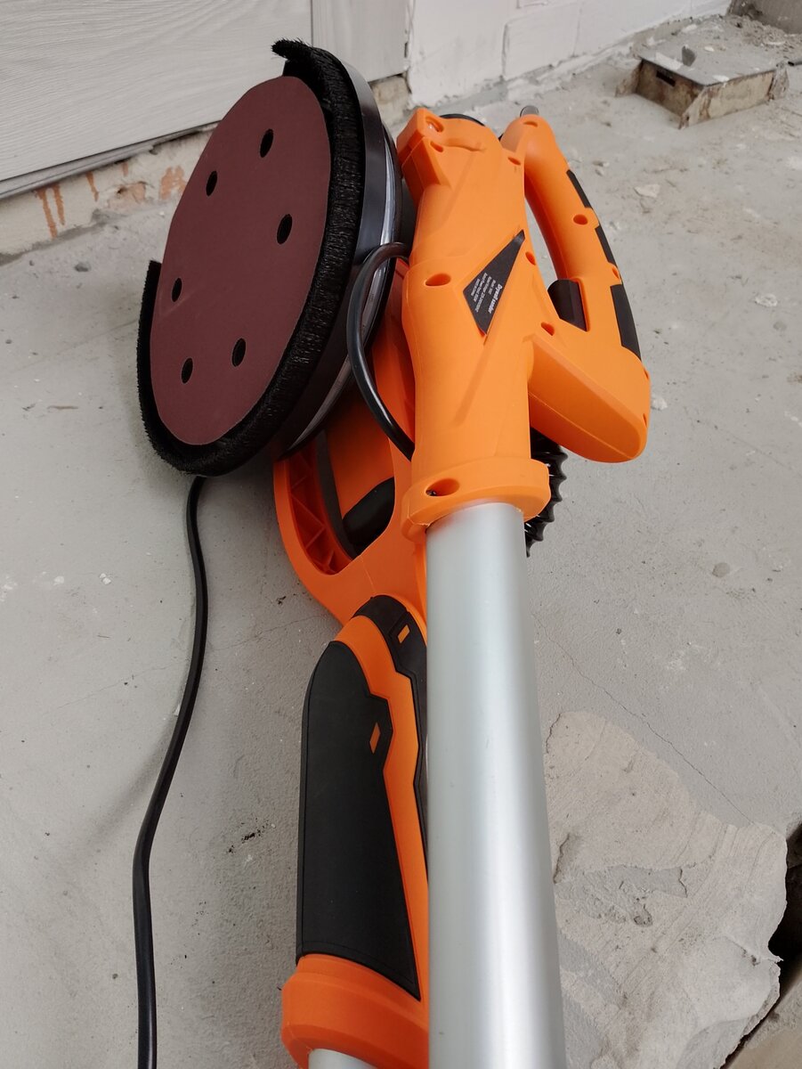 Здравствуйте! Прикупил себе вот такой вот инструмент. Изначально брал что бы отшлифовать, или попробовать как оно будет в гостевом домике в Ялте. Но в тот раз не успел. Поэтому опробовал его уже на объекте в Парусе. Тем более там и место самое подходящее. Коридор на втором этаже, где проем лестницы. Думал Ирина справится без меня, но стоять над проемом, на лестнице, как то страшновато, так что пришлось шоркать мне. И эта шлифмашинка, по простому жираф, очень помогла. Шкурка на сто двадцать зернистостью, и почти двести пятьдесят в диаметре, быстро очистили стены. На гаджете подсветка, так что видно что делаешь, даже несмотря на пыль. Некому было снять процесс ее работы, да и несмотря на встроенную улитку пылесоса, и мешок для пыли, этой самой пыли достаточно. Очень длинная ручка, это немного не удобно в ограниченном пространстве коридора, зато возле потолка, а высота почти два семьдесят, спокойно достал без помощи стремянки. Квадратов восемнадцать заштукатуренных финишной шпат