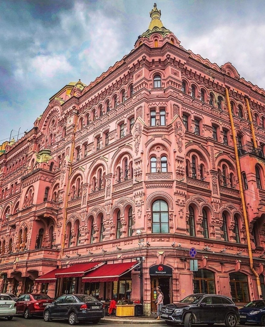 🏛 "Дом Терем" Розовый дом архитектора Николай Басина. 🗺 Санкт-Петербург, переулок Крылова, 7/5, метро Гостиный двор. ⭐️ Здание, которое носит имя дома Николая Басина, выделяется среди окружающих его строений, воплотивших в себе принципы классицизма. Этот дом стал источником вдохновения для императора Александра III в процессе изменений в военной форме, и с момента своего появления остается одним из ключевых убежищ для тех, чья судьба тесно связана с расположенным неподалеку Александрийским театром. 📝 Дом архитектора Басина на площади Островского является вызовом архитектуре Росси, который задолго до него украсил площадь зданиями в стиле прошлых времён. Дом Басина стремится выделиться и привлечь внимание яркими украшениями на фасадах — рельефными изображениями петухов, похожими на украшения русских теремов, а также другими декоративными элементами. Различные детали в отделке также намекают на открытое проявление «русскости»: кокошники, столбики-кубышки, лепнина, напоминающая рез