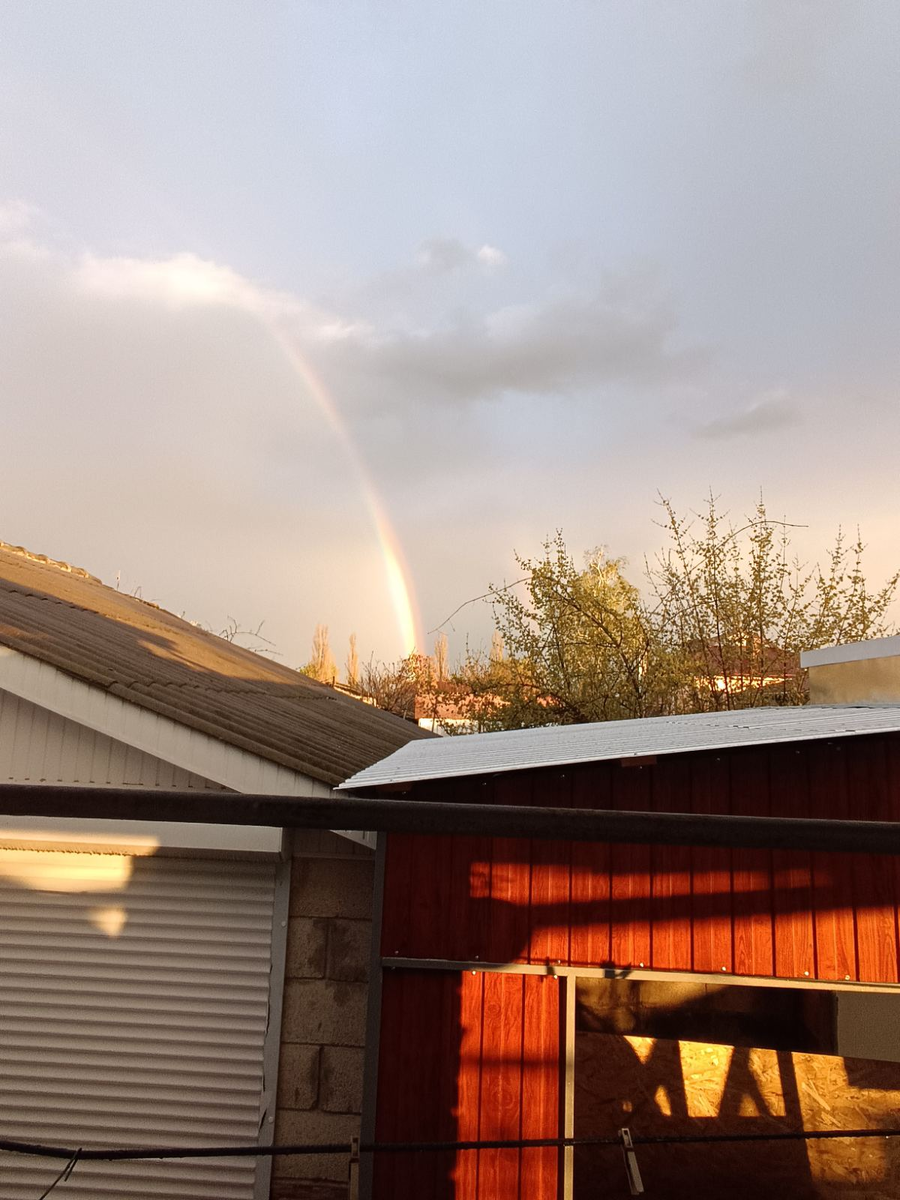 "Смотри! Эх, не сфоткать с улицы...Давай хоть из кухни! Красота какая после дождика.. А нет! И на улице получилось!" ..Встала в полнеба радуга, и такая на душе сделалась отрада...И утратила я бдительность... "В общем, наружные работы закончили мы с Сергеем. Но дрель сломалась. Я, пока ты занята была, съездил в гараж, взял у Игоря. Отдать надо. Пешком пойду. Почему пешком, я поняла только когда вернулся архитектор жизни моей.. Ну да ладно.. Работу и правда огромную сделали, достойную отдельной темы. А с утра - настоящее Благовещенье! Когда нет за душой дурных мыслей. Когда небо дождём вчерашним умыто... И тишина вокруг. И только птицы вовсю заливаются. А ещё колокола звенят... И полной грудью дышишь. И благодаришь, что - жив. Я перечитала давнюю свою о Благовещенье статью. Я в ней кое-что хорошее для всех нас придумала. Это два года назад было. К прежним печалям добавились новые.. Горько...Но - праздник сегодня! Давайте, как и тогда, делиться благими новостями. Я начинаю! Мы сегодня ед