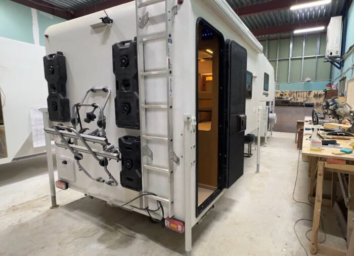 Всем привет, короткий обзор нашего нового жилого модуля. Это классический кемпер, который предназначен для быстрой установки в кузов пикапа. Подходит для кабин Тойота Тундра, Форд F серии и Додж Рам 1500 и 2500. То есть на любые Американские пикапы с кузовом 180-200 см. Как уже стало хорошей традицией- дверь сбоку. Двери ставим разные. В этот раз американский тип — с двумя отдельными дверями. Обычной и москитной. Заходим внутрь и попадаем в основное помещение. За 8 лет строительства жилых модулей сам не могу привыкнуть к визуальной разнице обьемов снаружи и внутри. Напоминаю что все что на фото находится в кузове 1800х1600 мм. Напомню размеры — общая длина модуля почти 4,5 метра, ширина 2.2 метра, а высота 2.1 м. Внутри на пару сантиметров меньше соответственно. По левой стороне расположены душевая кабина с кассетным туалетом и откидной раковиной. Размеры кабины 1.1х1 метр. Очень просторно. Далее идет кухонный блок с плитой и совмещенной раковиной. Большой вместительный обьем с ящикам