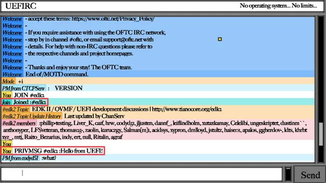 Разработчик программного обеспечения Филипп Теннен представил свой необычный проект - IRC-клиент под названием UEFIRC, который полностью работает в среде начальной загрузки UEFI, не требуя операционной системы. UEFI (Unified Extensible Firmware Interface) является современной версией того, что раньше называлось BIOS (Basic Input/Output System). Оба они выполняют одну и ту же функцию по запуску первой части программного обеспечения при включении компьютера, прежде чем может загрузиться операционная система. Таким образом, UEFIRC работает еще до загрузки Windows, Linux или любой другой ОС.Несмотря на ограниченные ресурсы среды UEFI, Теннену удалось создать практически полноценный IRC-клиент с графическим интерфейсом и поддержкой шрифтов TrueType. Программа написана на языке Rust. Как признается сам автор, этот проект задумывался скорее как шутка и вряд ли пригоден для повседневного использования. Тем не менее, он демонстрирует возможности платформы UEFI и заодно свое мастерство как разра