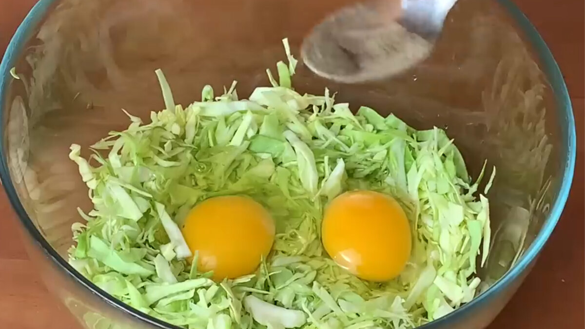 Для этого вкусного рецепта идеально подойдет молодая капуста, но также можно использовать и жесткую капусту. 200 граммов капусты нарезаю тонкой стружкой. Затем я ее немного обминаю руками, чтобы она стала мягче. Если же вы используете жесткую капусту, то ее нужно хорошо промять руками. К нарезанной капусте я добавляю 2 яйца. И щепотку черного молотого перца. Ингредиенты хорошо перемешаем между собой. Обратите внимание, что соль на этом этапе приготовления я не добавляю. Я это делаю намеренно, чтобы капуста не выпускала свой сок. Сковороду разогреваю на огне немножко меньше среднего. Смазываю растительным маслом и выкладываю сюда капусту яичную красоту. Придаю этой массе форму блина. Распределяю равномерно и хорошо подворачиваю края, чтобы у нас была такая вот красивая форма. Затем будущую вкуснятину накрываю крышкой и оставляю готовиться. Через пять минут я вижу, что низ уже подрумянился. Это легко проверить при помощи лопатки. Теперь этот капустный блин нужно перевернуть, а чтобы он