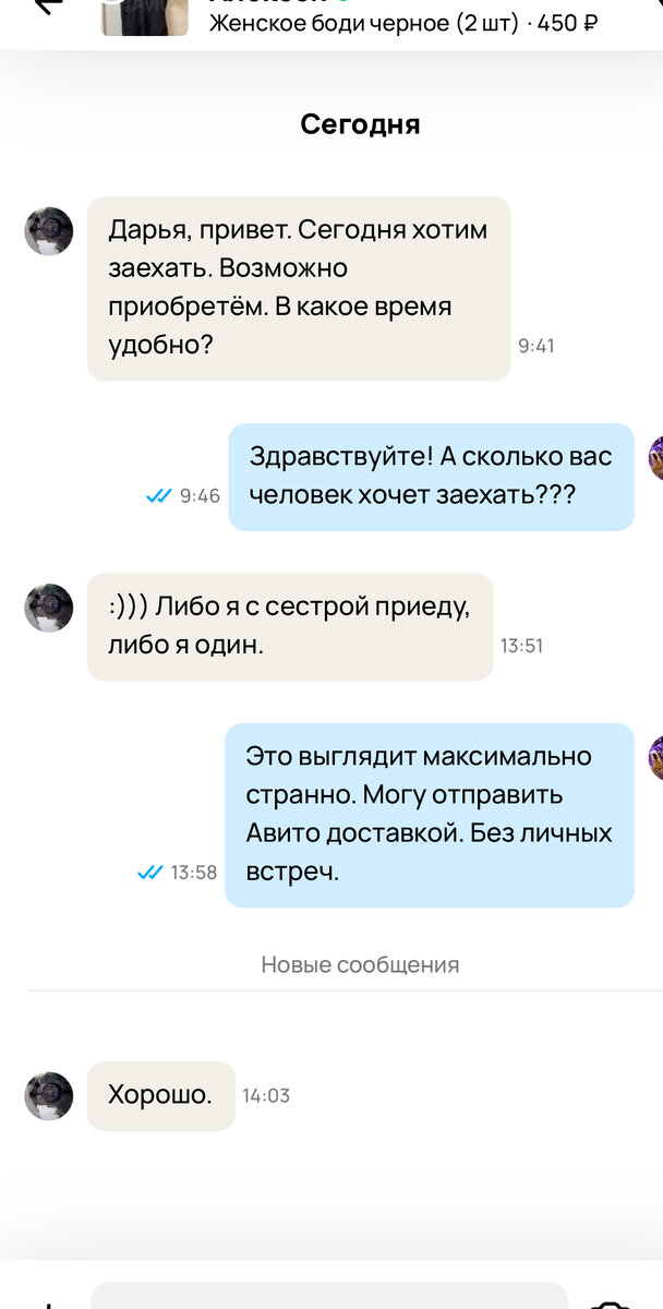 Тема «маньяков», пишущих везде, часто встречается. Но «сальные» разговоры более удивительно для меня было встретить на Авито, чем в любой из соцсетей. Самая первая «горячая» ситуация, о ней я писала ранее, произошла со мной много лет назад, в самом начале моего пути на Авито, - пристал «колготочник» с требованием показать туфельки (которые я продавала) на ножке в капроновых колготках. На мой отказ- накатал отрицательный отзыв, подробнее в посте: И спустя много лет, я решила выложить на продажу кружевные женские боди, которые подходит для ежедневного ношения, так как это кофта с прозрачными Элементами. Уже давно боди вошло в моду. Однако, на мой взгляд, является достаточно интимной деталью в одежде. Итак, у меня их два, использовались однажды для фотосессии. Состояние новых. Точную цену покупки не вспомню (плюс-минус 1500 за одно). Я назначила минимальную стоимость (за 2шт. 450 руб.) Долгое время никого боди не интересовали. Потом объявление стало добавляться в избранные у пользовате