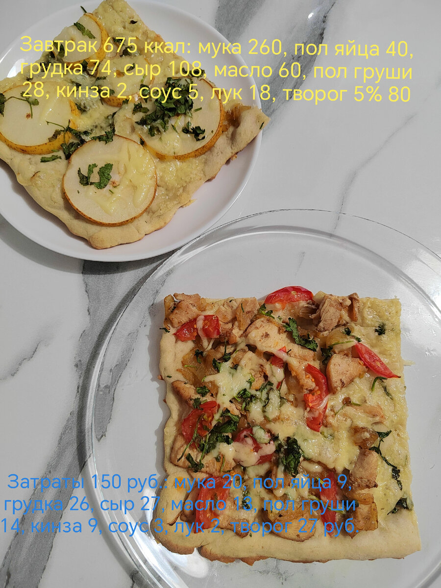 Сегодня на завтрак пицца на рисовой и гречневой муке. Расчет приведен на одну порцию, 675 калорий, два куска. Один с курицей, другой с грушей, как десерт. Тесто: мука из зеленой гречки 38 гр, мука из бурого риса 38 грамм, половина яйца, полпачки 5%го мягкого творога Простоквашино, чайная ложка разрыхлителя. Все смешать, оставить минут на 15. Начинка, первая половина пиццы: 65 гр куриной грудки, полголовки лука, 20 гр соевого соуса 0.5 ложки оливкового масла, пара помидоров черри. Соус разбавляем в два-три раза водой, маринуем в нем грудку и лук минут 5, потом слегка обжариваем их на оливковом масле, слив предварительно соус. Начинка для второй , десертной части пиццы: пол груши. Сыр и кинза идут на обе половины. Распределяем тесто на пергаментной бумаге, смазанной слегка маслом. Тесто липковатое и рыхлое, поэтому делать надо все аккуратно. Из одной пиццы получилось и основное блюдо и десерт Конечно, калорийность такого завтрака немалая, но пока у меня большой вес, такая калорийнос