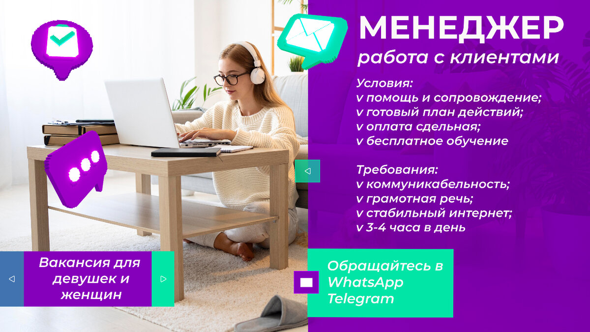 Описание: Мы ищем активных, коммуникабельных и ответственных девушек и женщин для работы в нашей онлайн-школе. Ваши задачи будут включать общение с клиентами, помощь в выборе курсов, поддержку пользователей и многое другое.