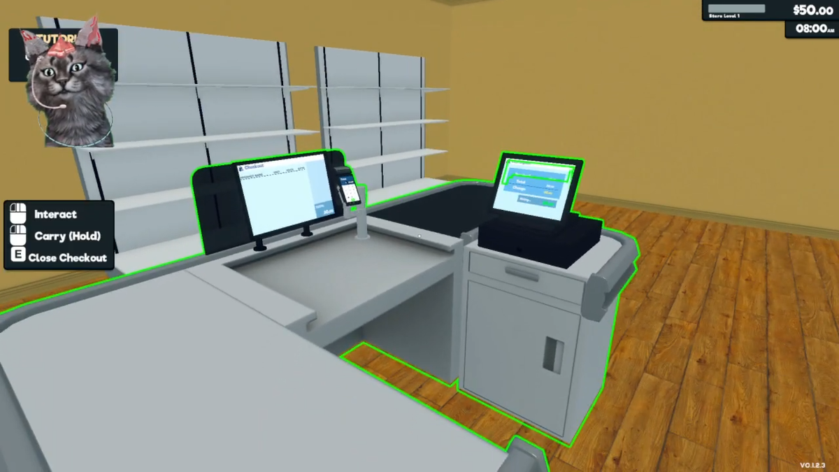 В течение дня приходится обслуживать покупателей на кассе. Оплата принимается наличными или банковской картой. В случае наличных покупателю может потребоваться сдача, которую необходимо набрать самому из кассового аппарата. В случае карты требуется ввести сумму на терминале оплаты. Все действия осуществляются мышкой, хотя разработчики обещали поддержку ввода цифр через клавиатуру.