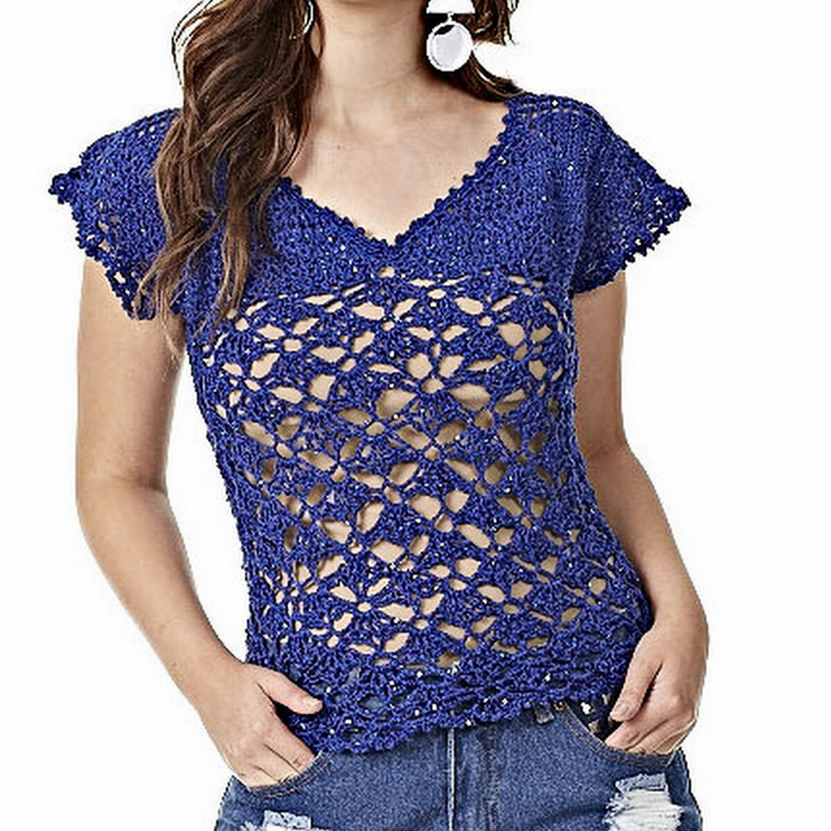 Для вязания топа № 1 нам потребуется 5 мотков — на размер 44-46 — васильковой пряжи с люрексом: 95% мерсеризованный хлопок, 5% металлизированная фибра; 50 гр — 135 м. Крючок № 2,5-3.