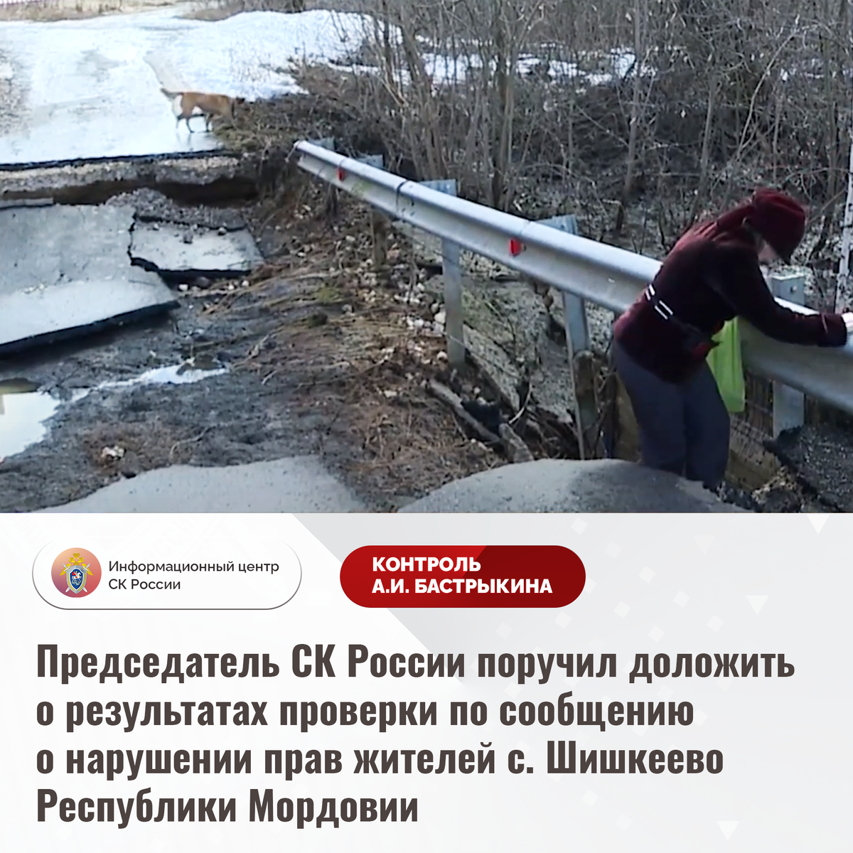 В комментариях в социальной сети в СК России сообщается о разрушении из-за паводка в апреле текущего года автомобильного моста в селе Шишкеево Республики Мордовии. Аналогичная ситуация произошла в 2022 году, когда был разрушен подвесной мост, однако работы по его реконструкции проведены не были. В результате местные жители полностью отрезаны от основной части поселка, возможность подъезда специализированных служб к жилым домам отсутствует.
