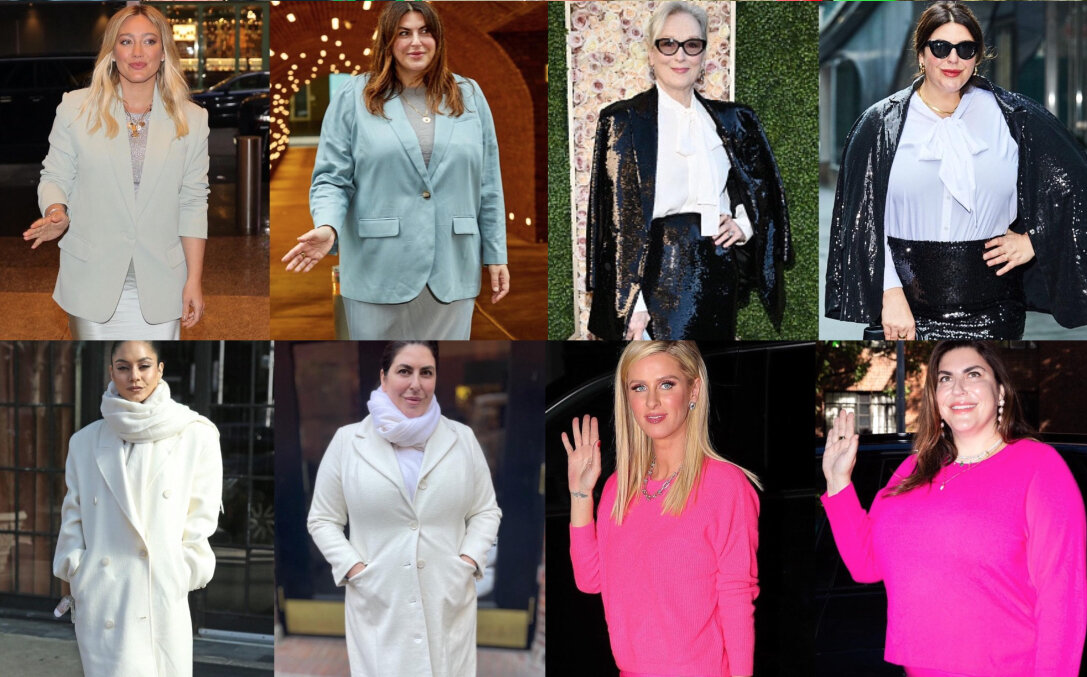 Хейтеры нервно курят в сторонке уже не первую сигарету, потому как образ удался. За счет жакета легкого оверсайз фигура скорректирована идеально. Более того длина жакета заканчивается чуть ниже самой объемной части бедер. Юбка эффектно скрадывает размер. Светлая обувь завершает монохромный образ. Вытянутый мыс туфель всегда стройнит.