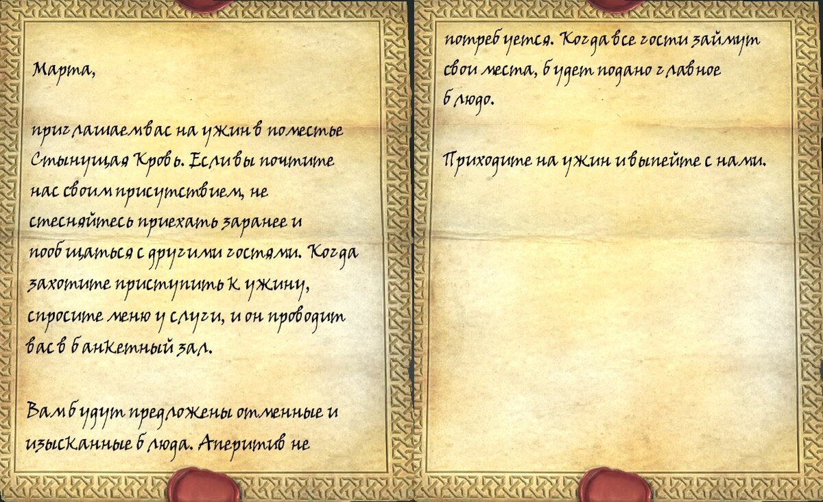 Шёл Довакин, никого не трогал - а на встречу, глянь, гонец бежит. Ну, что опяяять? - Тебе письмо, на вот, возьми... В письме некий аноним любезно приглашал нас посетить мир на весь.., эм, точнее в каком-то подземелье, видимо, там всяким тёмным личностям солнечный свет не вредит... Ну, собственно, поместье До такого грозного названия "Стынущая Кровь", явно не дотягивает. Небольшой мрак, пару ядовитеньких цветков и клетка для пленников - не то, что я ожидал увидеть. Хоть бы алтарь Молаг-Балу поставили что ли... Гости дорогие уже были все в сборе, болтали ни о чём и слушали барда. Так, орк... А что он здесь делает? Они ж из своих крепостей не вылазят то... Прислуга как могла развлекала гостей: