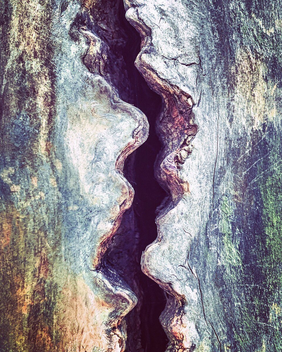 Что это? Извилистое русло высохшей реки в глубоком каньоне? Или снимок поверхности какой-нибудь экзопланеты? А может быть это микроорганизм? Нет, это ствол старого дерева. Глубокая трещина расколола его много лет назад. Края этой раны уже давно зарубцевались, сгладились бесчисленными дождями, ветрами, сменой сезонов. Удивительно, но дерево это не погибло, оно продолжает жить. Пусть его ствол давно облюбовали в качестве дома, или точнее говоря, целого города муравьи и жуки, оно как и прежде качает корнями влагу из земли, доставляя питательные соки до самой верхушки, где шелестят под нежным ветерком зелёные листья. Видите - просто старое дерево, а какая история. У нас есть какая-то особая связь с этими большими растениями. Не даром столько песен и стихов связаны именно с деревьями. Возможно, мы даже не осознаем в полной мере какое это грандиозное сокровище - деревья. Какая это огромная удача жить в той части света, где миллионы квадратных километров покрыты лесами. Нам, скорее всего, и