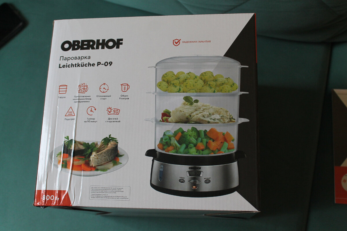 Пароварка Oberhof Leichtküche P-09 На коробки пароварке предстваленны варианты приготовленных блюд и её характеристики. На эту пароварку предоставляется двух летняя гарантия европейского уровня. Инструкция написана на русском языке, так же в ней имеются подборка рецептов. У пароварке имеются три чаши с ручками каждая чаща имеет свой номер. Так же в ней есть углубления для приготовления яиц, всего можно приготовить их 18 штук, общий объем чащ составляет 9 литров. Так же имеется чаща для риса. Шнур имеет заземления, длина шнура составляет 1 метр. Резервуар для сбора излишней жидкости. Отсек для заливки воды на 1,2 литра. Уровень воды контролируется по шкале, в случаи её испарения пароварка отключится, но в любой момент воду можно долить. У пароварке три кнопки, имеется индикаторы готовки и завершения дублирующие звуковым сигналам, имеется дисплей. Есть крышка, на пароварку можно ставить как одну чащу, так и сразу три. При включение начинается моментальный прогрев. Овощи не разваливаются