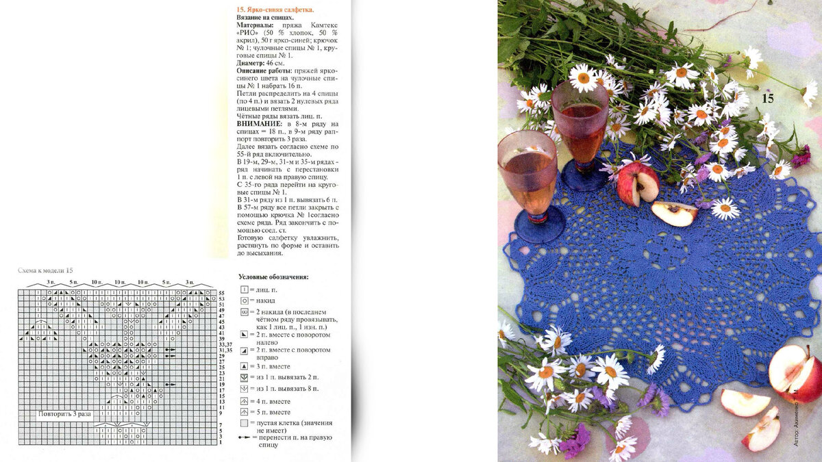 Круглые салфетки со схемами для вязания на спицах с цветочными узорами