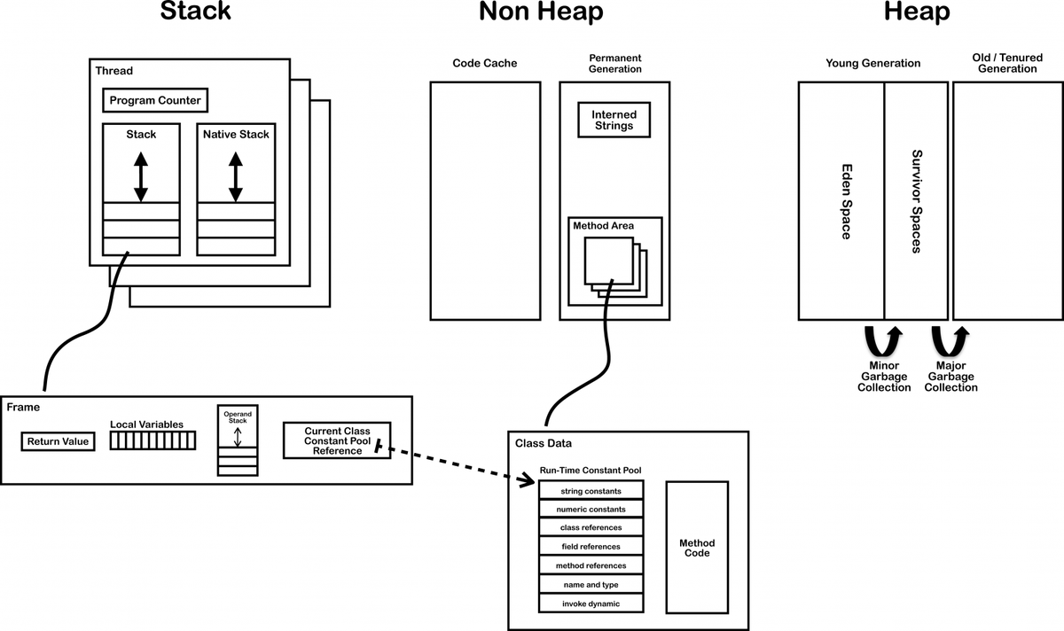 JVM разделяет используемую ею память на две области: куча (heap), в которой хранятся данные приложения, и не-куча (non-heap), в которой хранится код программы и другие вспомогательные данные.