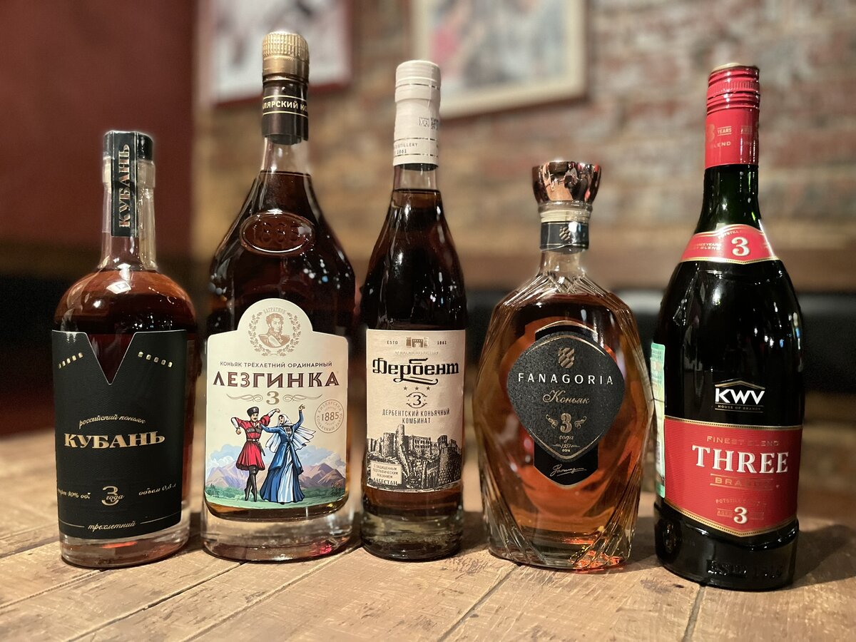 Дегустация ординарного коньяка 3 года выдержки. На этот раз мы выбрали напитки от российских производителей, обладающих собственными виноградниками и запасами спиртов. Эти производители могут гарантировать, что их продукция сохранит статус «российского коньяка» в 2028 году, согласно поправкам к ГОСТ о том, что начиная с 2027 года, наименование «коньяк» будет возможно только для напитков, сделанных из российского винограда. На данный момент у нас есть несколько таких компаний и для дегустации мы отобрали трехлетние коньяки от производителей: Дербентский Коньячный Комбинат, Кизлярский Коньячный Завод, Фанагория и Новокубанское, но добавили для ориентира по оценке известный бренди из ЮАР - KWV 3 года, который получил хорошие отзывы. Задачей дегустации было проверить, насколько коньяки соответствуют заявленной категории, выявить возможные дефекты и оценить общее впечатление от напитков. Оценка проводилась по пятибалльной системе. Оценка 3* Лезгинка Виноградные сорта: Ркацители, Подарок Маг