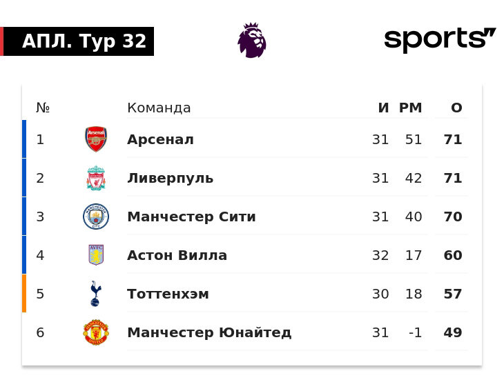 «Арсенал» благодаря голам лидирует. После яркой ничьей «Ливерпуля» с «МЮ» (2:2) лидера АПЛ определяют не по очкам. Теперь все решает разница мячей, важнейший дополнительный показатель пока лучше у «Арсенала»: мощнейшие +51 против +42 у «Ливерпуля» и +40 у «Сити». Почему «Арсенал» лидирует? Еще в 20-м туре были ниже конкурентов, теперь – отрыв Лондонцы сильно прибавили весной – 10 побед с общей разницей 38:4 плюс ничья с «Сити» в последних 11 матчах АПЛ. На старте чемпионата либо уступали по разнице, либо шли вровень с «Сити» и «Ливерпулем». На графике четко виден взлет «Арсенала» после 20-го тура, тогда за месяц разгромили «Кристал Пэлас» (5:0), «Вест Хэм» (6:0) и «Бернли» (5:0). Соперники в это время побеждали скромнее. Теперь такое сравнение – тоже важнейшая часть чемпионской гонки. Микель Артета задумался о дополнительных показателях еще в феврале. «Мы хотим не только набирать очки, мы хотим большего. Знаем, насколько важно быть впереди по разнице мяче», – слова испанца после разгро