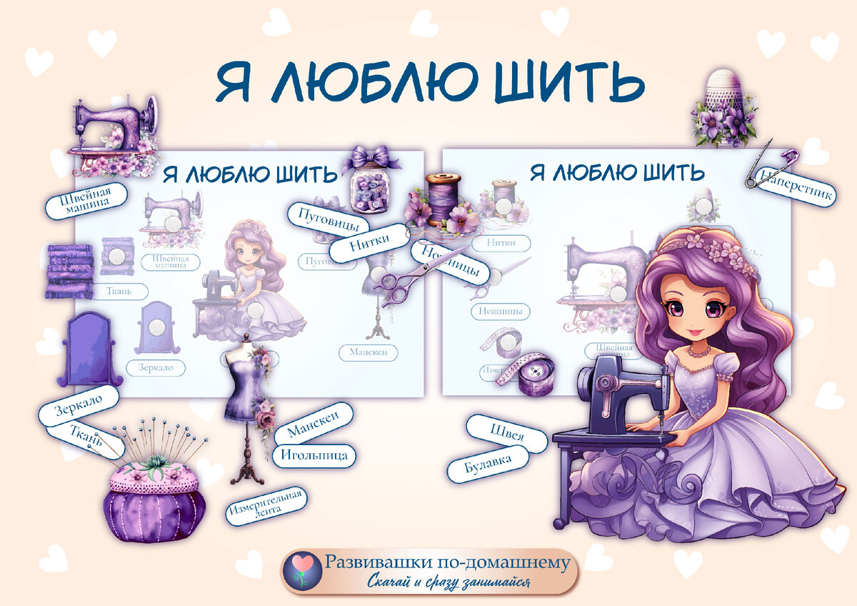 В душе я вообще-то рукодельница! Шью себе и детям одежду, для дома люблю что-то придумать и создать. В юности даже с первой зарплаты я купила себе швейную машинку - электрическую (у нас дома тогда была только ручная швейная машинка). А когда появились дочки, то всегда хотела найти игру про швейные принадлежности... Таких не было. Прошло время, теперь я сама могу создавать любую игру, какую только захочу! Поэтому игра на липучках "Я люблю шить" - это осуществление моей давней мечты. С радостью делюсь ей с вами: На одном поле все швейные принадлежности не уместились, поэтому создала их два. Для игры я взяла за основу самые главные инструменты швеи - это швейная машинка, манекен, ткань и зеркало для примерки. А также все немаловажные мелочи: нитки, ножницы, пуговицы, булавки, наперсток и измерительную ленту Шаблон игры состоит из 4 листов, его можно скачать перейдя по ссылке в Мой каталог игр (в рубрике Профессии и занятия): Подписывайтесь на канал "Развивашки по-домашнему", у меня много