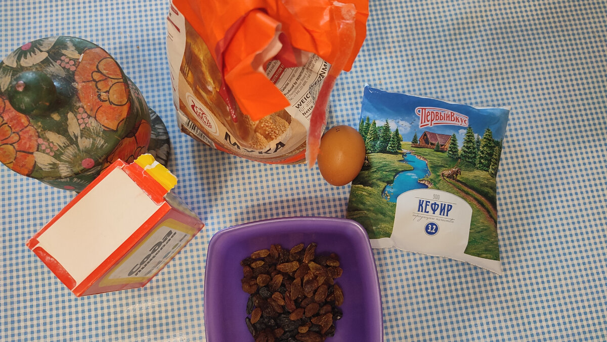 Кефир, яйцо, изюм, мука, соль и сода. Сахара нет, поэтому взяла изюм, да и вообще, так намного вкуснее.
