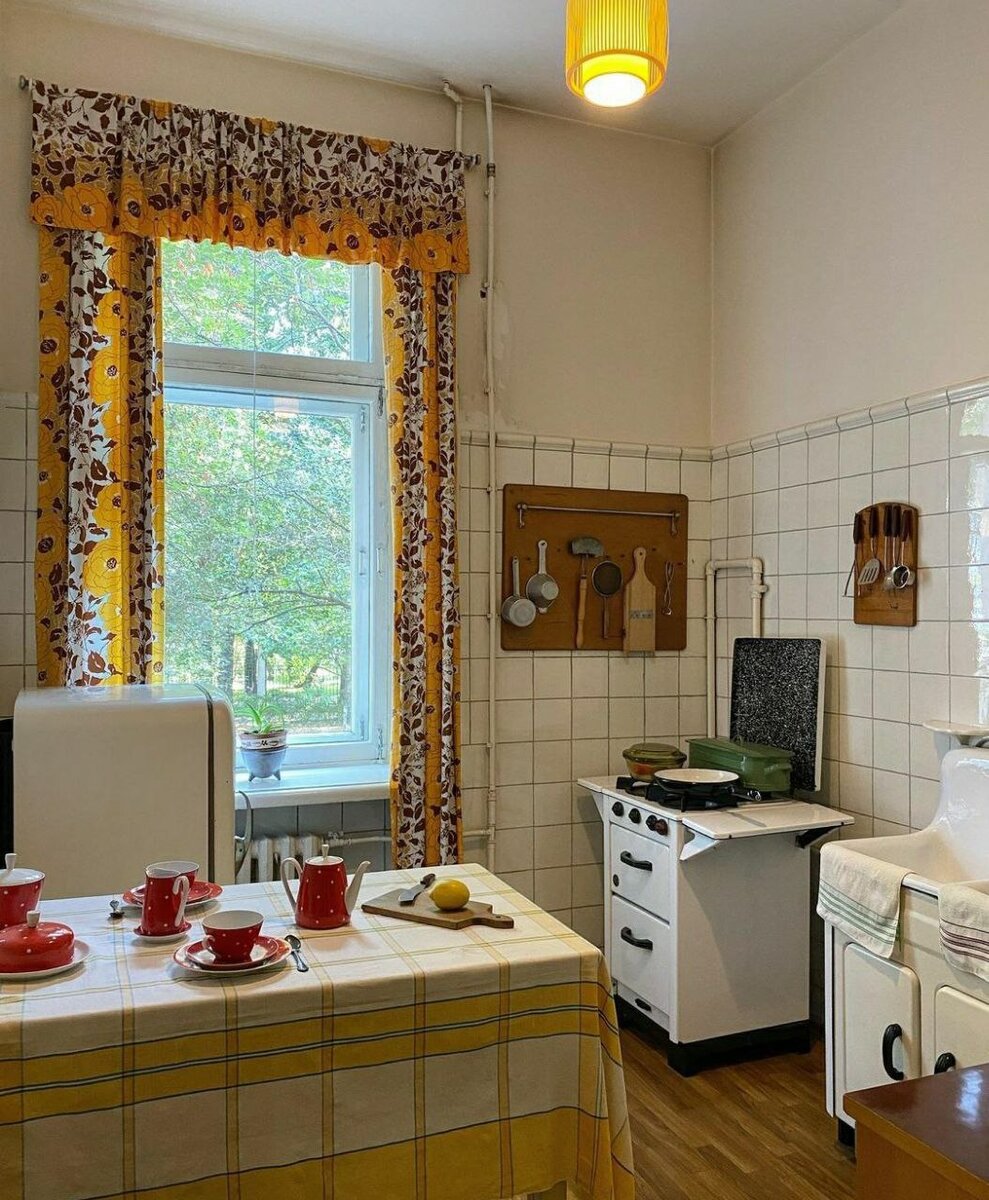 Несмотря на наши с вами вопросы, мне кажется, что здесь всё очень уместно. Есть в этом то самое очарование и магнетизм любимого многими советского интерьера, с присущей ему скромностью и простотой. При этом всё прекрасно сочетается с современными решениями, например, такими как двери скрытого монтажа.