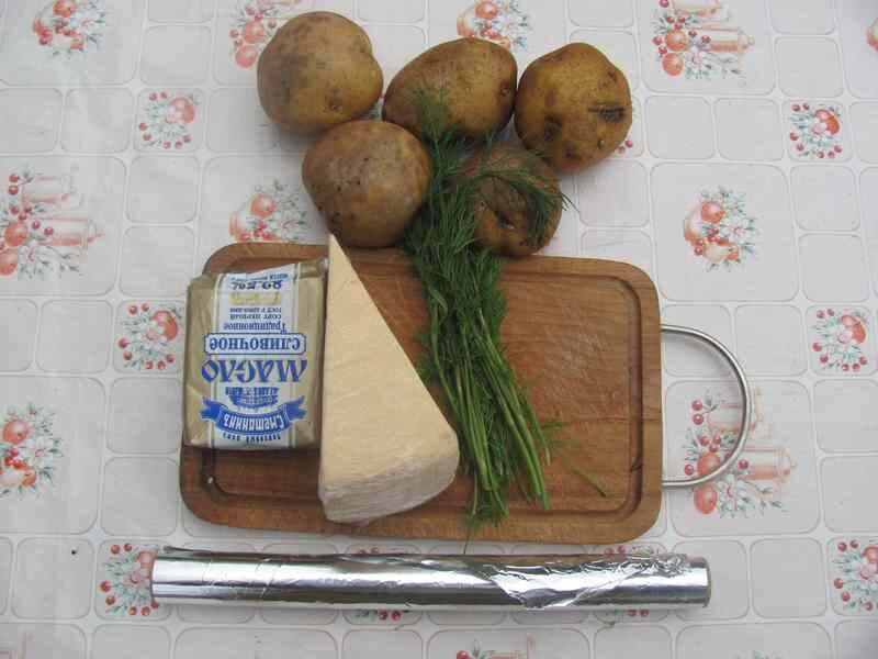 Сегодня мы приготовим по-настоящему загородное блюдо: картофель, запечённый с сыром. Загородным мы обозвали его потому, что запекать будем картошку, выращенную своими руками на дачном участке, к тому же в углях на мангале. В домашних условиях это блюдо можно приготовить в духовке. Для приготовления картофеля, запечённого с сыром, нам понадобится: Способ приготовления: возьмём 5 картофелин и хорошо помоем их водой. Если участников ужина много, соответственно, число продуктов тоже нужно увеличить. Вытрем картофель досуха и завернём в фольгу. Перед этим мы заранее нажгли углей в мангале в таком количестве, чтобы ими можно было закрыть овощи. Палочкой сделаем в углях углубление и положим все картофелины в мангал, закрыв их углями, на 30-40 минут. Пока овощи запекаются, натрём на мелкой тёрке сыр и нарежем укроп. Через полчаса вынем вилкой картошку из углей. Положим её на разделочную доску, развернём фольгу и разрежем на 2 части. Картофель должен быть рассыпчатым, а кожура запечённо