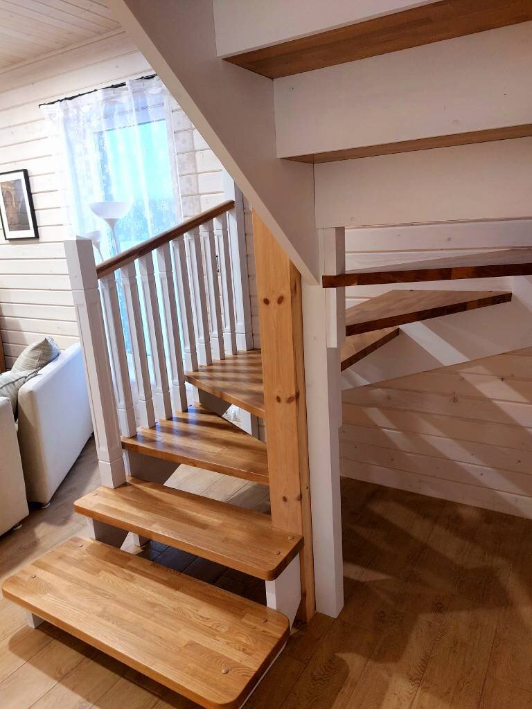Сложность изготовления была в том, что нужно было совместить забежной столб со столбом, который являлся опорой 2 этажа и уже стоял на таком месте, где нельзя было его никуда сдвинуть. Местонахождение — Полянское сельское поселение, Выборгский район, Ленинградская область. Забежная лестница с поворотом на 180 градусов выполнена из комбинированного материала (каркас – сосна, покрашена белой эмалью, ступени и поручень – сращенный дуб, покрыт износостойким лаком в 2 слоя). 👍 Нашли такое решение: были произведены точные замеры и проект нарисован в специальной программе. В опорном столбе заказчика сделан паз под первую забежную ступень, а в столбе лестницы сделан во всю длину вырез, куда входил другой столб. ✅ На лестницы дополнительно сделали ограждение по левой руке. Так как ступеньки шириной 300 мм, заказчик попросил сделать по две балясины на ступеньку, чтобы уменьшить расстояние между ними и тем самым подчеркнуть фрезеровку рисунка балясин. ✅ Так же были изготовлены по чертежам заказч