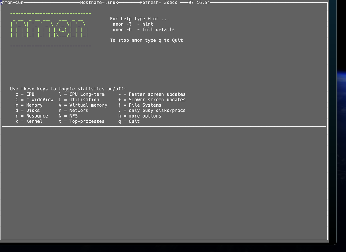 Nmon — инструмент для мониторинга производительности для Linux. C помощью его функционала вы можете узнать следующие параметры: Установка nmon Centos/RHEL yum install nmon Установка nmon Ubuntu/Debian sudo apt-get install nmon По завершению установки запускаем программу командой nmon Вам нужно выбрать 1 или несколько соответствующих букв : Можете выводить сразу несколько слоев на одно окно просто использовать несколько букв. В nmon можно по времени собирать данные nmon -f -s 90 -c 40 -f указывает на необходимость записи данных в файл -s устанавливает промежуток времени , в нашем случаи 90 секунд -с устанавливает количество захватов данных По завершению будет создан файл с расширением .nmon лучше его открывать и смотреть через nmonchart