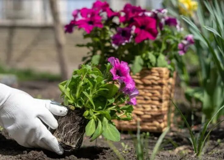 Место для петуний в общих клумбах выбирается исходя из размеров кустов. Обычно для цветка лучше всего подходит нижний, реже средний уровень клумбы. Перед посадкой саженцы в горшках хорошо поливают, каждый саженец следует переместить вместе с комом земли, посадив его в заранее выкопанную ямку.