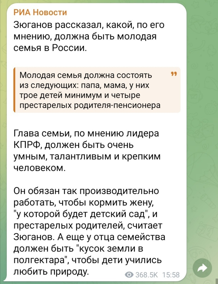 Удивил Геннадий Зюганов, лидер партии КПРФ (или уже не лидер? не особо слежу за его карьерой). Политик заявил, что правительство взяло курс на построение нового общества. Базироваться оно будет на вековых семейных ценностях. Скриншот новости: Что-то мне аж жалко стало главу этого семейства. Ладно, своих детей кормить, но еще четырех пенсионеров. Это гипер нагрузка, вы не находите? А почему он их кормить обязан? Да потому, что все эти годы, Зюганов, который находился у власти, не смог обеспечить пенсионерам такой уровень жизни, чтобы зятю в карман не заглядывали. Я не знаю, многие ли так живут, но в моем окружении просить деньги у детей - стыдно. У всех есть свои небольшие накопления. Люди не шикуют, но и на чужой шее не висят. От дорогих подарков отказываются. В старости вообще подарки не нужны, нужно внимание. Бабушки-дедушки просят меня им на телефон 100 рублей закинуть и тут же деньги протягивают. Я говорю - не надо, оставьте, это мелочь, но они настаивают, не хотят быть в долгу.
