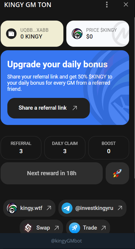 От создателя TON появился KINGI , достаточно заходить один раз в день и забирать свою монетку!