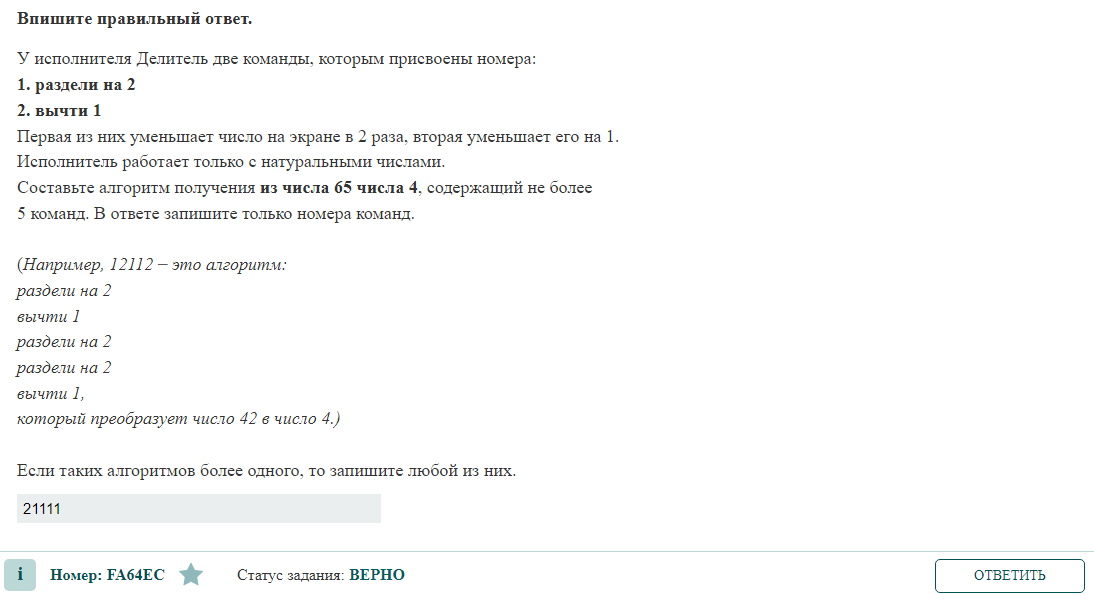 5 команд. В ответе запишите только номера команд. (Например, 12112 –– это алгоритм: раздели на 2 вычти 1 раздели на 2 раздели на 2 вычти 1, который преобразует число 42 в число 4.) Если таких алгоритмов более одного, то запишите любой из них. РЕШЕНИЕ 1) 65 не делится на 2 без остатка, вычитаем: 65-1=61 Команда 2 2) 64 делится на 2 без остатка, делим: 64/2=32 Команда 1 3) 32 делится на 2 без остатка, делим: 32/2=16 Команда 1 4) 16 делится на 2 без остатка, делим: 16/2=8 Команда 1 5) 8 делится на 2 без остатка, делим: 8/2=4 - искомый результат Команда 1 ОТВЕТ 21111
