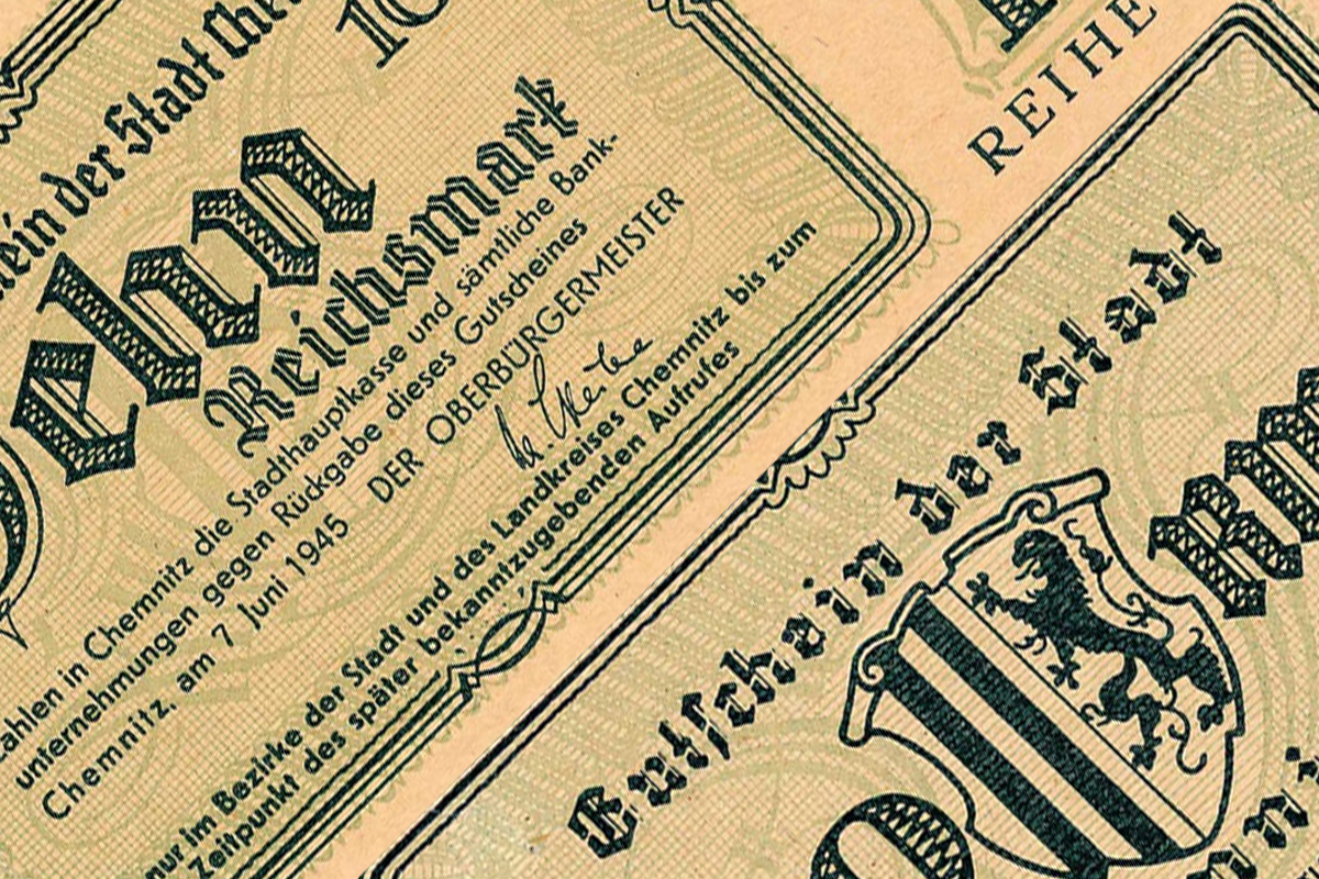 После появления в 2014 году каталога нотгельдов "Между фронтами", как всегда предполагалось, появились новые выпуски "чрезвычайных денег". Сообщалось также о вариантах к уже ранее известным выпускам. После обнаружения в 2015 году чрезвычайной денежной эмиссии в размере 5 рейхсмарок из Радебурга от 30 апреля 1945 года в сентябре 2019 года последовало сообщение о находке банкноты в 20 рейхсмарок из Крайльсхайма от 5 мая 1945 года. А теперь, Хемниц в Саксонии: спустя более чем 75 лет, в августе 2021 года стали известны печатные формы банкнот номиналом 10 рейхсмарок. Банкноты, напечатанные по отдельности аверсная и реверсная части, предлагаемые на eBay, несомненно, являются подлинными. Купюры имеют размеры 123 х 62 мм (лицевая сторона) и 118 х 61 мм (оборотная сторона) соответственно, на листах нет водяных знаков и контрольного номера. Однако на лицевой стороне можно прочитать предполагаемого издателя: город Хемниц. Нотгельды на 10 рейхсмарок, предназначенные для выпуска, должны были иметь