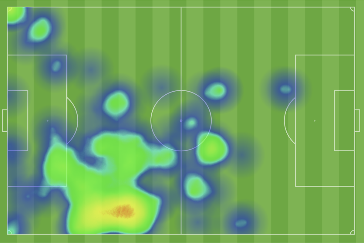 В игре с «Кристал Пэлас» (победа «Сити» 4:2) мечта Грилиша сбылась на 100%. Пеп внезапно поменял зону КДБ, отправив его в левый полуфланг. Причем сознательно закрепил позицию за бельгийцем – ему почти не разрешалось ее покидать. Вот тепловая карта Кевина в матче – очень характерный акцент на левом фланге, где по привычке вышел Джек: