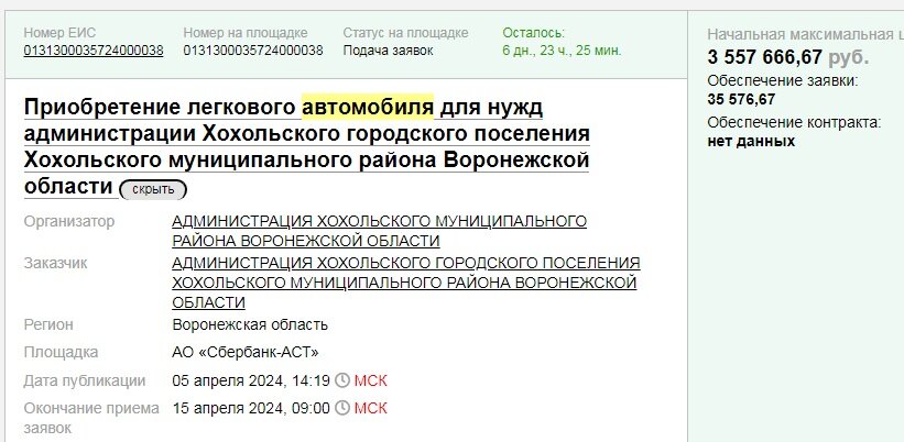 Глава администрации Хохольского городского поселения 53-летний Владимир Уколов решил обновить парк муниципального автотранспорта. За 3 млн 557 тысяч рублей для нужд городского поселения, в котором проживает около 13 тысяч человек, местные власти хотят купить иностранный внедорожник – HAVAL DARGO. На каком именно маршруте городского пассажирского транспорта будет заниматься «перевозкой людей» эта иномарка, пока не объявлено. О желании приобрести за бюджетные деньги внедорожник HAVAL DARGO за 3,5 млн рублей стало известно в прошлую пятницу, когда на сайте госзакупок появилась соответствующая информации о проведении торгов. Их возможный победитель может быть назван уже в начале следующей недели. Вполне возможно, что в аукционе примет участие только одна компания (автодилер), и с ней будет заключен контракт по максимальной цене - в 3,5 млн. скриншот сайта госзакупок Из документов закупки следует, что для разрешения покупки за бюджетные деньги внедорожника HAVAL DARGO глава администрации Хо