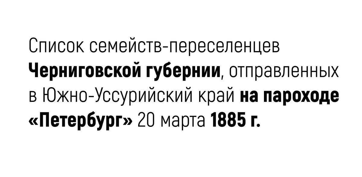Ниже привожу список казеннокоштных переселенцев из Черниговской губернии, Суражского и Мглинского уездов, отправленных в Южно-Уссурийский край на пароходе «Петербург» 20 марта 1885 г. с указанием ФИО и возраста главы семьи, численный состав семьи*, откуда прибыли и куда поселились. Всего 125 семьи (841 человек).