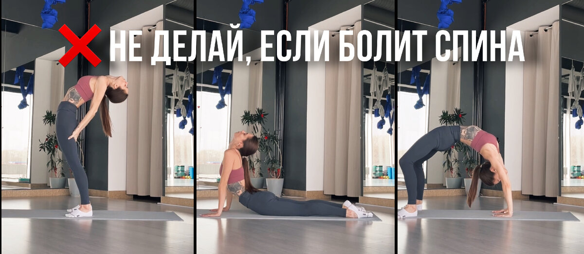 1. Прогиб стоя; 2. Прогиб лежа; 3. Мостик. Все эти упражнения негативно сказываются на состоянии поясницы. Особенно, если вы не обладаете хорошим навыком контроля и распределения движения во всём позвоночнике. Можете заметить на фото, что основная двигательная нагрузка в данных упражнениях приходится на поясницу и грудопоясничный переход. Эти зоны и так достаточно подвижны и перегружены. Тренировки для здоровья и уменьшения боли предполагают работу над стабильностью, а не развитием дополнительной гибкости. Отдельное внимание хочется уделить шейному отделу позвоночника, который также испытывает избыточную нагрузку в этих движениях, что может привести к головокружению и головной боли. Обращаю ваше внимание, что я говорю о фитнесе для здоровья взрослых людей, а не о спорте высоких достижений, где такие упражнения важны и исключать их нельзя. Приглашаю вас выполнить несколько здоровых упражнений для развития подвижности позвоночника вместе со мной. Переходите по ссылке, чтобы получить до