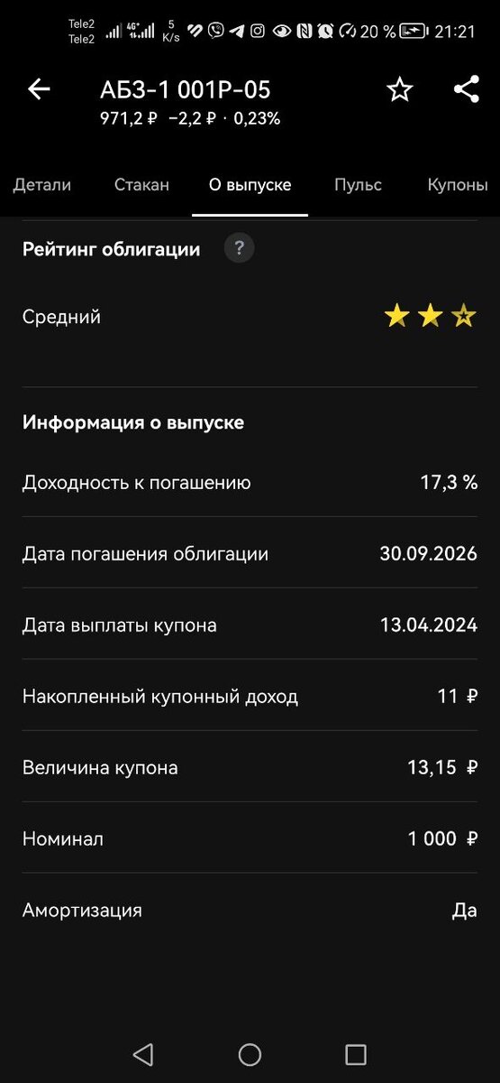 Я взяла на пробу, с выведённых за последние дни средств следующую облигацию.👇 Хотела взять ещё, несколько, но к моменту готовности нажать кнопку "купить" в секунде закрылась биржа для торгов. Посмотрим, может это знак! И стоит повременить. И понаблюдать! Время покажет. Пойду посмотрю акции пока на свободные средства. Или Фонды. Кстати, по данной облигации доходность к погашению обещает быть 17,3 % годовых, купоны в размере 16% годовых (по 13,15 руб в месяц буду получать). Срок гашения 30.09.26 года. ✅Начала Формировать ежемесячные деньги с неба, пусть и по 13 руб. в месяц😊 Обращу внимание, что это "старые" деньги, 03.06.23 заведенные на брокерский счёт на покупку акции Х5 за 1500 руб. и проданные 02 апреля за 2800 руб. Полученную выгоду я не вывела, а реинвестирую в портфель. Идём, к мечтам о безбедном будущем))) Более опытные знатоки в облигациях, поделитесь своими знаниями опытом, толковый выбор? На что стоит обращать внимание в покупке облигаций, как определить реально в