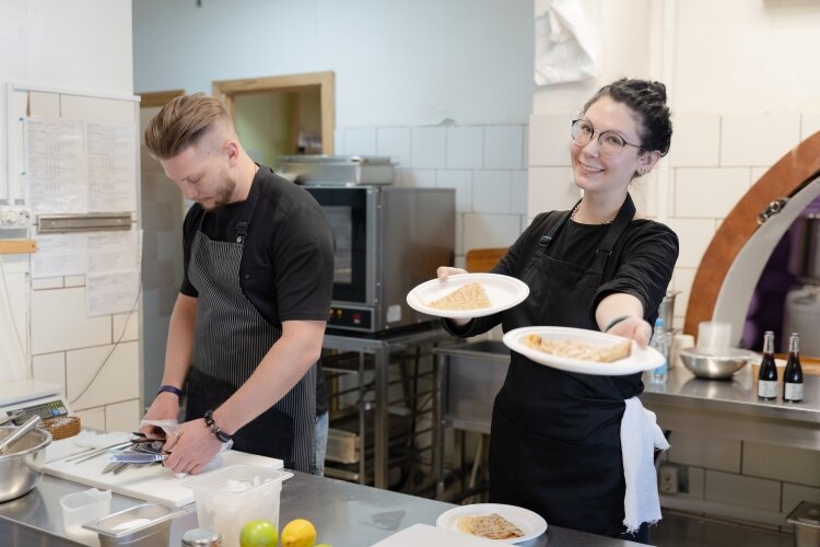 Прибираем кухню, разогреваем сковородки. В заведениях блины обычно пекут на специальных блинницах – больших круглых агрегатах. Даниил показывает, как ими пользоваться: вообще-то процесс мало чем отличается от выпечки блинов на простой сковороде. Разогреваем поверхность, выливаем тесто, разравниваем, переворачиваем. Конечно, с первого раза у меня не получается, но потом все идет как по маслу!