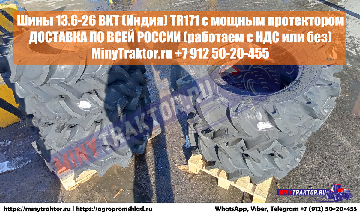 13.6-26 6PR BKT TR 171, 13.6-26 шины 6PR BKT TR 171, 13.6-26 6PR BKT TR 171 аналог Bridgestone, шины на трактор 13.6-26 6PR BKT TR 171, минитрактор.ру На нашем складе новый привоз индийских шин от производителя BKT (Ballkrishna Industries Limited) в размере 13.6-26 6PR с высоким мощным грунтозацепом TR171 для японских тракторов. Покрышки 13.6-26 6PR BKT являются аналагом шин Bridgestone которые устанавливаются как штатные на минитрактора. Мощный грунтозацеп TR171 будет вгрызаться в почву при работе трактора. Видео установленных шин на тракторе от нашего Покупателя можно посмотреть по ссылке https://youtube.com/shorts/XJKpseEAGyw?si=zhcKGnzRc1wnJEEd Так-же у нас можно приобрести шины на переднюю ось в размере 8-18 (8.00-18) 4PR BKT TR 171 с таким-же высоким протектором. Шины отгружаем по всей России, работаем с юрлицами и физлицами, с НДС или без. Шины 13.6-26 6PR BKT TR 171 https://minytraktor.ru/shina-136-26-6pr-bkt-indiya-tr-171-120a6-tt