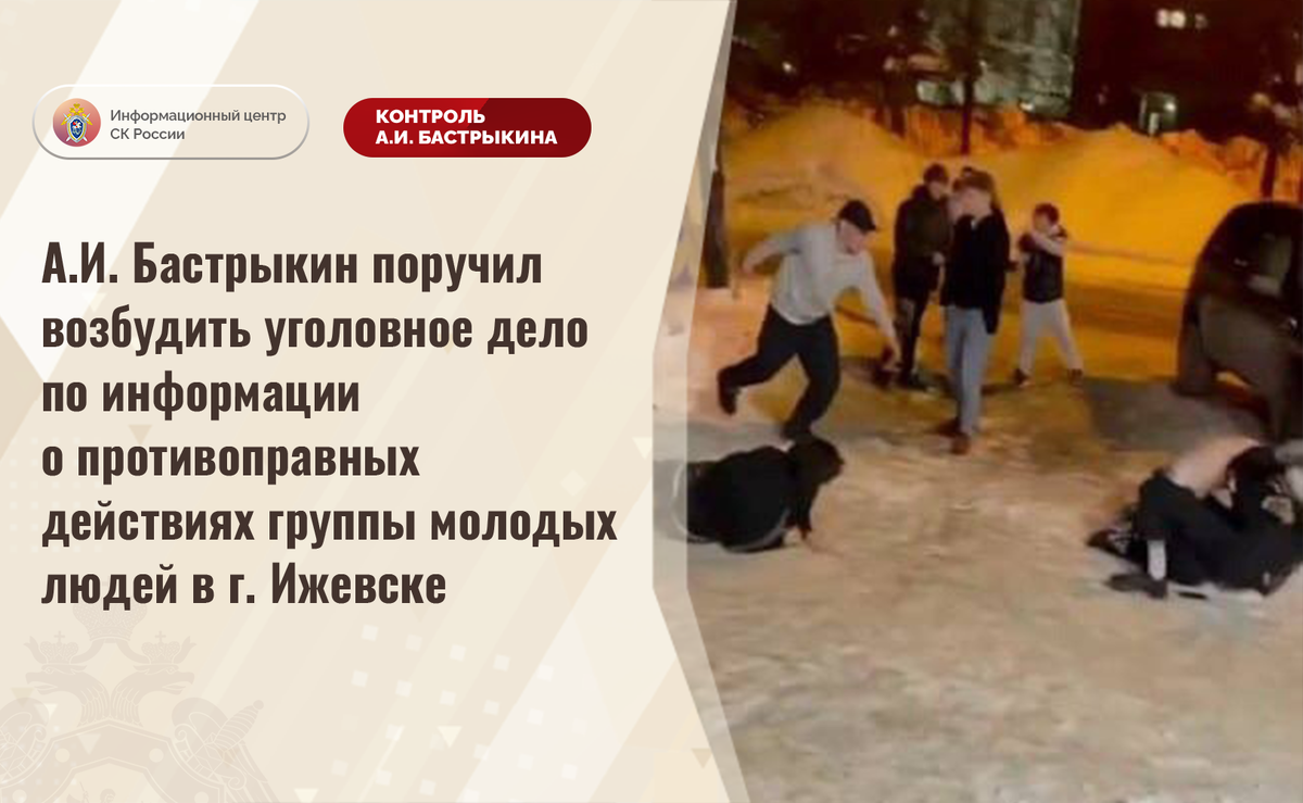 Внимание Председателя СК России А.И. Бастрыкина обращено на распространяющуюся в социальной сети и СМИ информацию о том, что в городе Ижевске Удмуртской Республики группа молодых людей систематически применяет физическую силу к прохожим, снимая происходящее на видео и выкладывая записи в сети Интернет.
