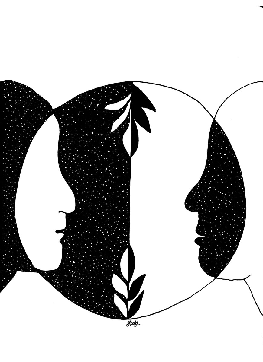 Встреча Ещё одна самая не простая работа. В процессе создания я была до конца не уверена, какой она получится в итоге и получится ли вообще. Обычно я не рисую портреты людей, только стилизованные или абстрактные. Вдаваться в дополнительные подробности почему это так не хочу, а расскажу вам об идеи данной иллюстрации. Изначально здесь было только два профиля и никакого солнца, с растениями не было в планах. Но мне показалось без этих деталей как-то незавершенным или даже скучным. Что же касается солнце, оно здесь изображено в затмении. Не знаю, очевидно ли это? Мне кажется, что вот такое необычное сочетание солнце и двух профилей с маленькими деталями в виде растений, делает работу особо привлекательной. А так же не могу не отметить, что рисовать на этом формате (А4) мне всегда дается тяжело. Но несмотря на это, рисовать именно в этом скетчбуке, о котором расскажу отдельно, мне очень нравится!