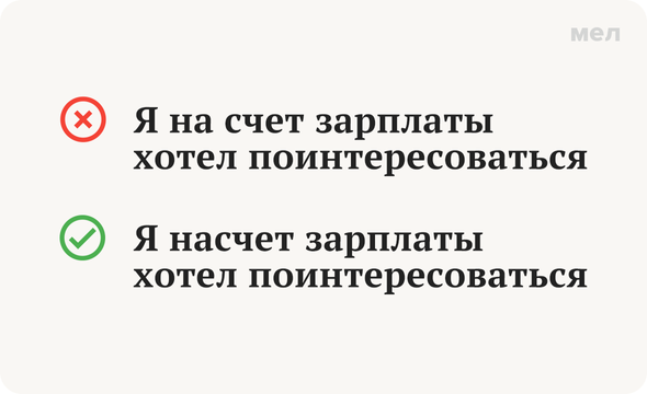 Казалось бы, очень похожие слова, правописание которых должно фиксировать одно и то же правило. Но здесь всё немного сложнее. Или проще. В общем, есть нюанс и его стоит запомнить, чтобы никогда не ошибаться. Суть здесь вот в чем: слово «насчет» и сочетание «на счет» существуют, но это разные части речи. В зависимости от того, предлог это или существительное с предлогом, мы пишем их слитно или раздельно. «Насчет» — это предлог, он не употребляется без главного слова. То есть в предложении предлог «насчет» должен иметь к чему-то прямое отношение. В нашем примере это слово «зарплата». Второй способ распознать предлог — он никогда не появляется в конце предложения. А еще его можно заменить на предлог «о». Если мы имеем дело с существительным «счет» и предлогом «на» — заменить их на «о» не получится. Второе правило — раздельного написания требуют случаи, когда мы говорим конкретно про счет — банковский, сберегательный, счет спортивного матча или счет как процесс: А вот с сочетанием «за счет
