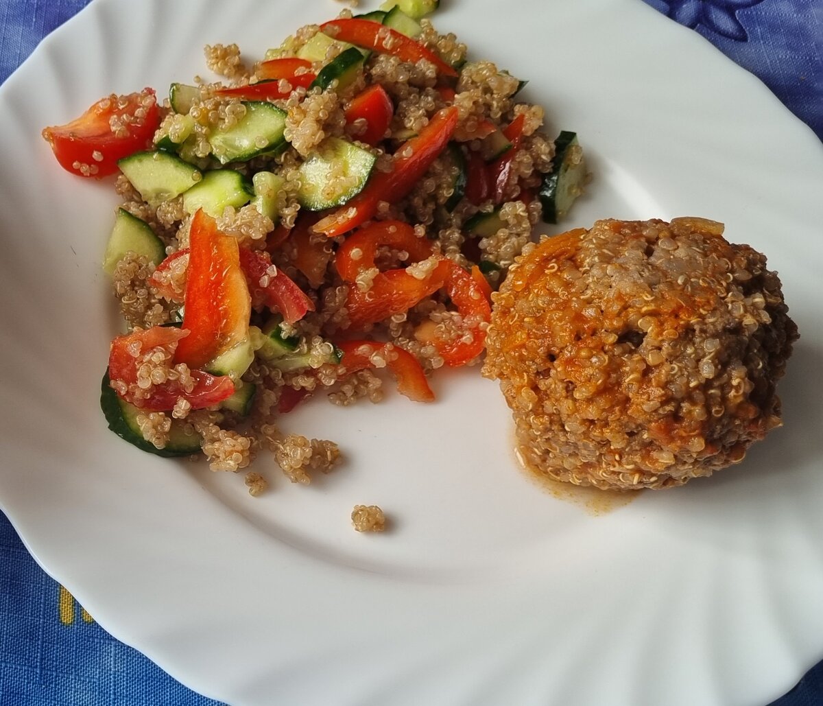 Нам нужно: 400 г фарша 100 г киноа уже отварного 1 большая луковица 1 большая морковь 1 банка томатов в собственном соку Соль, перец по вкусу Половину луковицы мелко нарезаем, добавляем в фарш, туда же отваренное киноа, солим, перчим, хорошенько вымешиваем. Делаем тефтели. Обжариваем половину луковицы, тертую морковь, добавляем томаты в собственном соку, загущаем немного мукой, провариваем соус немножко. В соус выкладываем тефтели и тушим до готовности. Я все делала в скороварке . Получается вкусно, но более пышно чем с рисом.