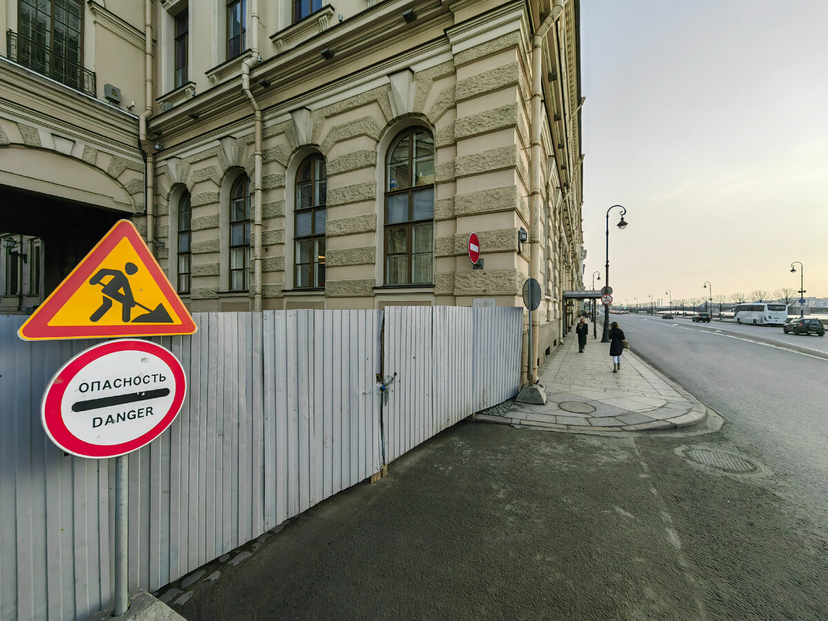 Много раз ходил по Дворцовой набережной, а также по набережной Зимней канавки, но не очень внимательно смотрел на стены. Всё больше на воду. А на фасаде одного из зданий сохранился довольно интересный артефакт.