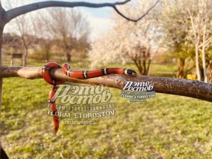 Змейку нашли на Северном, неподалёку от родника Сурб-Хач, где она грелась в тёплых лучах ласкового весеннего солнышка. В постах говориться об Африканском полозе, но это мнение ошибочно. Судя по типичному для этого вида яркому окрасу из чередующихся красных, белых и чёрных колец речь идет именно об американской ползучей переселенке. Остается непонятным откуда она взялась в оживлённом районе донской столицы. В Ростовской области такие змеи не водятся. Даже по названию вида становится ясно, что она прибыла в наш регион с другого континента. Скорее всего, ползучая беглянка жила в домашнем террариуме, но потом потерялась.