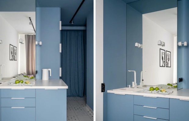 Из однокомнатной квартиры дизайнер создала две полноценные студии с потрясающими кухнями — сегодня рассказываем про одну из них Дизайнер Ника Чередникова создала очень интересный проект: однушку площадью 34 кв. м она превратила в две полноценные студии. На крохотном метраже удалось организовать все необходимое: от грамотного хранения до двух кухонь-гостиных. А самое главное — уложились в бюджет 2 млн рублей. Сегодня рассказываем про первую компактную кухню с необычным фартуком — вдохновляйтесь и берите на заметку интересные идеи. Первая студия получилась в холодной цветовой гамме — здесь удалось разместить четыре основных функциональных зоны. Кухня занимает самое большое место. На полу использован керамогранит: бюджет был ограничен, поэтому отдали предпочтение российскому бренду. Стоимость — 900 руб./кв. м. Геометрический рисунок добавляет контрастность и разбавляет цвет пола. На стенах — краска, с помощью которой сделали колор-блок: выделили зону кухни и прихожей. Фасады кухни подбира