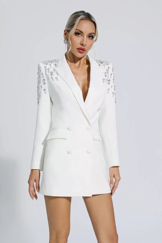 Давайте откроем для себя самые красивые и модные блейзеры весны-лета 2024. Из кружева, денима или букле, модных цветов, с узорами и аппликациями из стразов! Как выглядят блейзеры из новых коллекций? Бренды варьируются от изящных форм в букле и кружева до моделей городского стиля из джинсовой ткани, но также обращают внимание на предложения в сезонных модных цветах. Одно- или двубортные, с поясом и стразами, длинные, короткие вплоть до платьев-жакетов, давайте подробно рассмотрим самые красивые и модные блейзеры весны! 1. Белый блейзер со стразами Среди блейзеров 2024 года, которые нельзя пропустить, несомненно, лидирует модель в белом цвете. По-настоящему элегантное изделие, украшенное стразами. Можно носить его с костюмными брюками или джинсами, чтобы создать повседневный шикарный образ. Или даже надеть с платьем-комбинацией контрастного цвета. 2. Бежевый льняной Блейзер в мужском стиле с лацканами, застежкой на одну пуговицу и карманами с клапанами. Модницам такие модели очень нравят