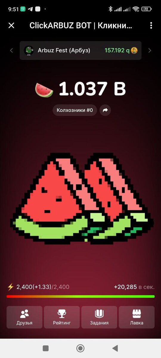 Это простая игра внутри телеграм, в которой можно (и нужно!) зарабатывать монетки, арбузики, просто кликая на экран, которые (монеты) затем можно будет продать или обменять на другую криптовалюту внутри телеграм или в дальнейшем вывести на другие биржи. В игре можно прокачать автокликер и он уже сам будет атоматически кликать эти монетки без вашего участия, я так и сделал, захожу только утром и вечером чтобы улучшить этот автокликер. На мой взгляд проект довольно серьезный и есть неплохие перспективы, учитывая насколько мощно и быстро сейчас развивается криптовалютная экосистема внутри телеграм. Давайте расскажу немного подробней, сам кликер выглядит следующим образом Внизу есть разделы ЛАВКА и ЗАДАНИЯ. В заданиях есть небольшие задания (да-да!)) выполняя которые будут начисляться дополнительные арбузы, которые можно использовать для прокачки. Я так и сделал, выполнил большинство заданий (нужно подписываться на телеграм каналы), за это насыпали арбузы и уже за них я стал прокачивать