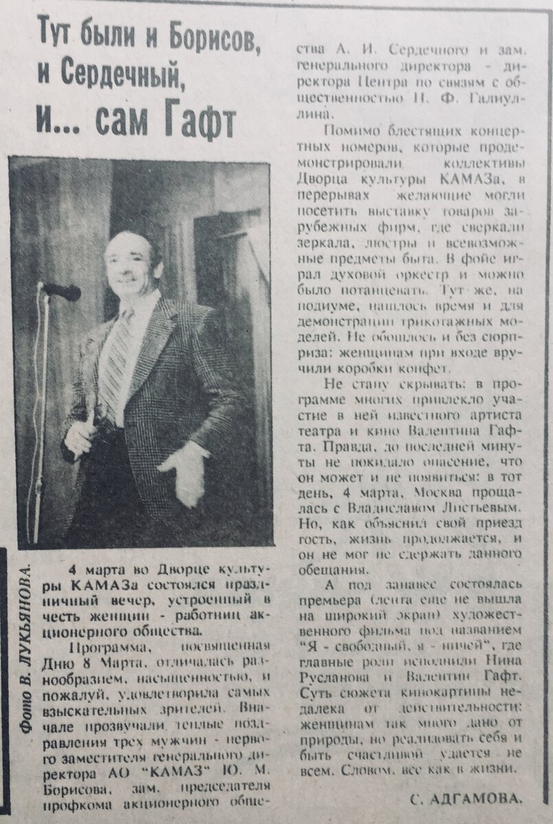 4 марта 1995 года в ДК КАМАЗА выступал Гафт Валентин Иосифович (1935-2020) - актёр советского и российского театра и кино, народный артист РСФСР. Вот как об этом сообщалось в газете «Вести КАМАЗа» от 7 марта 1995 года.
