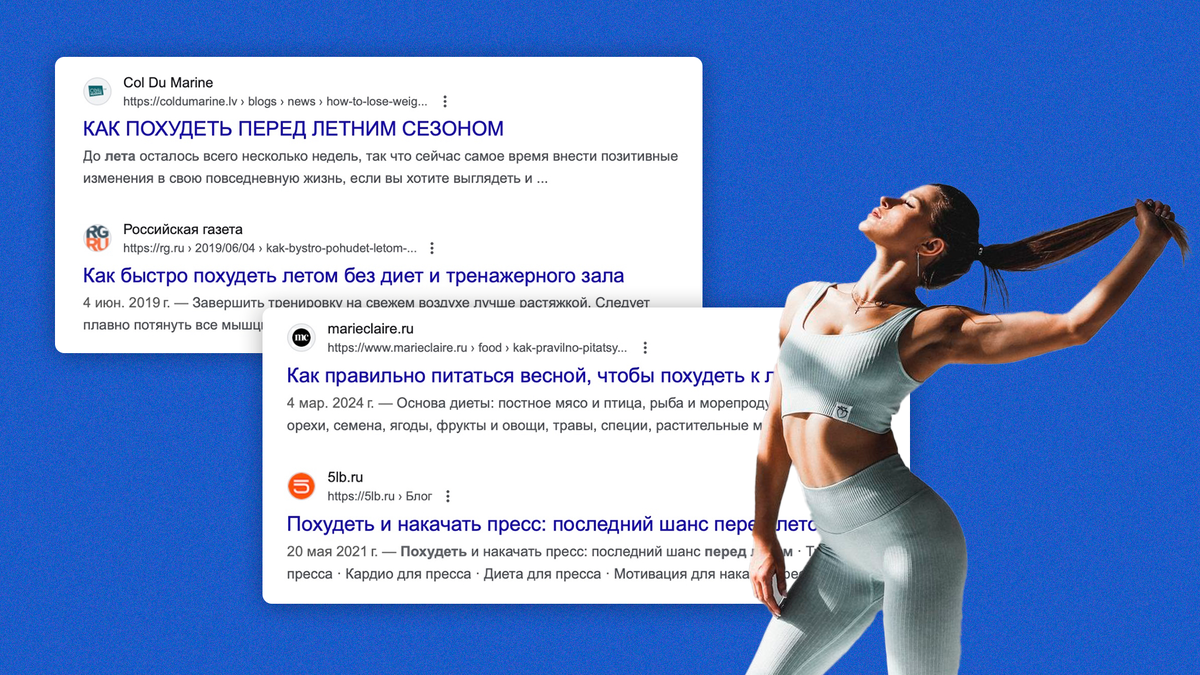 Если мы посмотрим запросы в любом поиске о похудении (смотрите картинку выше) перед летним сезоном, то везде увидим: “ПОСЛЕДНИЙ ШАНС!”. “ПОХУДЕЙ ЗА НЕДЕЛЮ”, “А ТЫ УЖЕ ПОХУДЕЛ К ЛЕТУ?” – и другие кричащие заголовки, призывающие срочно что-то сделать с этим.